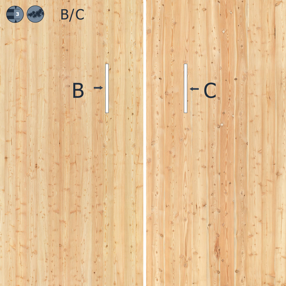 Fugendichte Oberfläche, schlichtes bis leicht grobjähriges Holz, gesunde festverwachsene Äste, vereinzelt schwarze Punktäste zugelassen, vereinzelt leichter Buchs vorkommend, geringe Markröhrenanteile möglich, leichte Farbabweichungen zulässig, leichte Risse an den Plattenrändern zulässig, Naturastdübel, Harzgallen und Harzgallenausbesserungen in größerem Ausmaß zulässig, vereinzelt Splint zulässig (bei Kiefer, Lärche und Douglasie), insgesamt homogenes Holzbild.